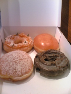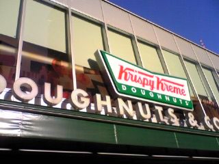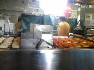 左側に写っているまだ白いドーナツが、だんだん右に流れていき真ん中の機械の部分でひっくり返され、揚げた面が見えるようになって右側へと流れていきます。