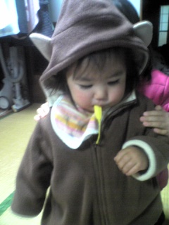 ちなみに、お下がりのこの防寒着、いやおさるコスプレセット、しっぽもついてます。