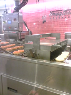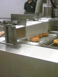 写真左:右から流れてくる生のドーナツがひっくり返って油であげられ、左に流れていく様子。